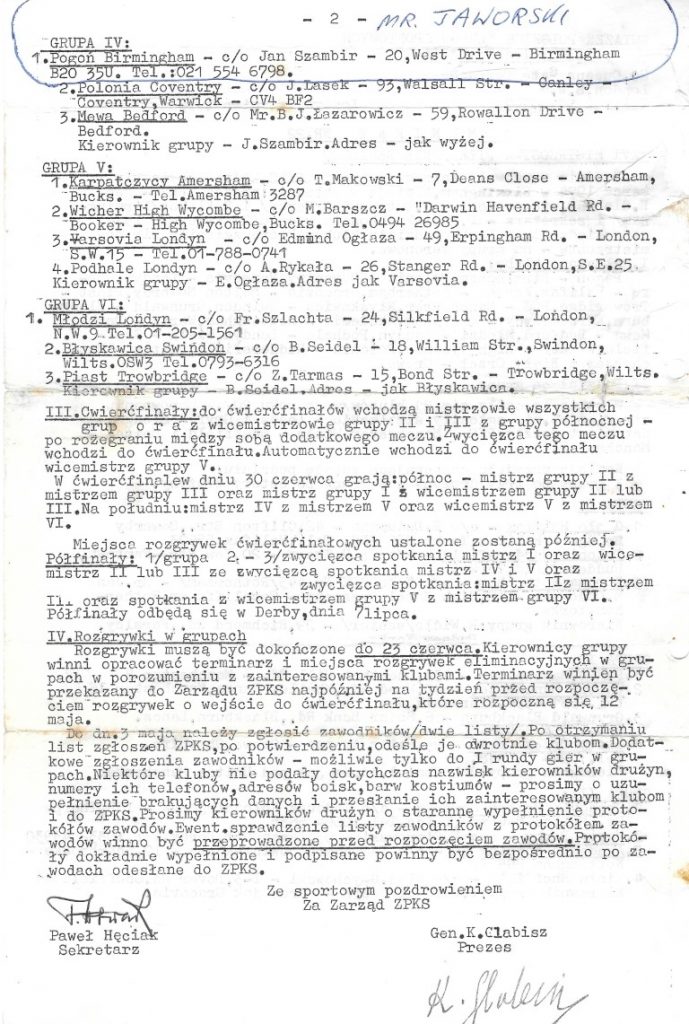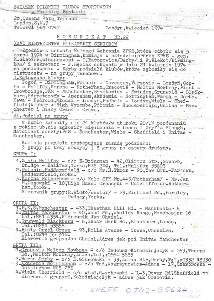 - Grupa II – PKS Manchester; Unitas Manchester; Grunwald Blackburn; Biały Orzeł Crewe