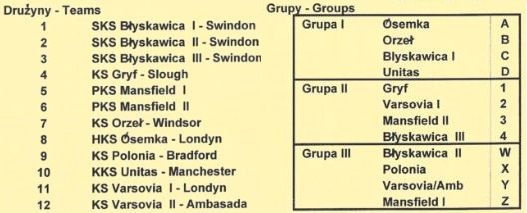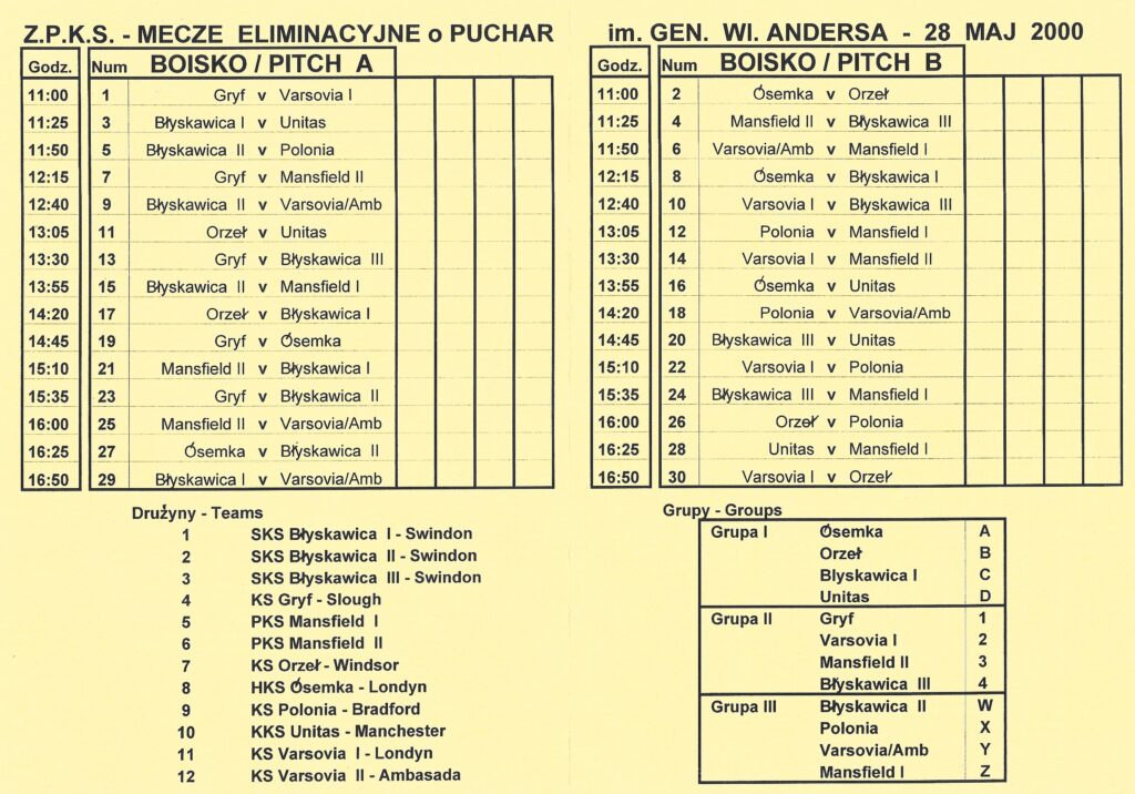 Football 2000 Sunday May 28 Posted By: piotr 28 May 2000 kto grał? Blyskawica Swindon, I,II,II PKS Mansfield I,II KS Gryf Slough KS Orzel Windsor HKS Osemka Londyn KS Polonia Bradford KKS Unita Manchester KS Varsovia Londyn KS Varsovia II Ambasada