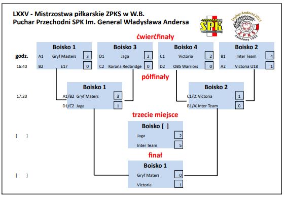 Nagrody: Nagrody drużynowe – Puchar Andersa 1 miejsce puchar i medale , 2 miejsce puchar i medale , 3 miejsce puchar i medale , 4 miejsce puchar . Puchar Pocieszenia im. Spadachroniarzy 1 miejsce puchar i medale , 2 miejsce puchar i medale . Ponad to przyznany będzie drużynowy Puchar fair play dla drużyny która najbardziej na to zasłuży na boisku i poza nim w oczach organizatorów . Nagrody indywidualne : Król strzelców ( będzie prowadzona klasyfikacja ) , najlepszy zawodnik i najlepszy bramkarz . Ponad to przyznamy również nagrodę Fair Play indywidualną – wybierać będą kierownicy drużyn z pierwszej ósemki .