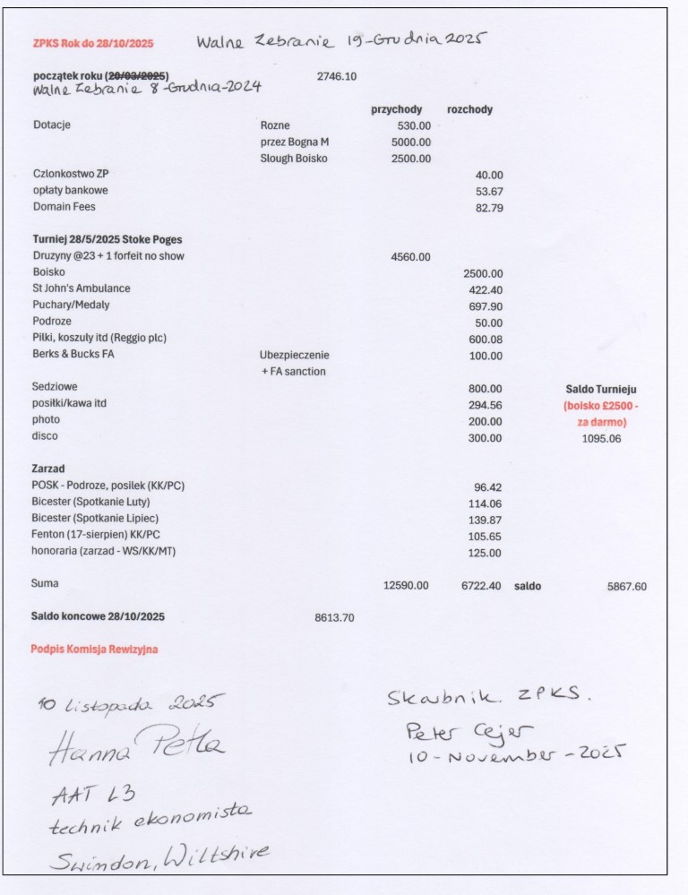 Sprawozdanie Skarbnika, zatwierdzony przez Komisja Rewizyjna: AAT (Association of Accounting Technicians) Level 3 Diploma in Accounting Hanna Petla. Dziekujemy.