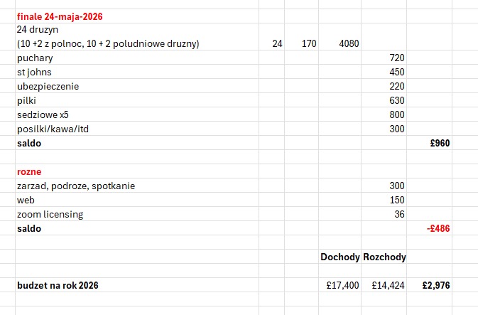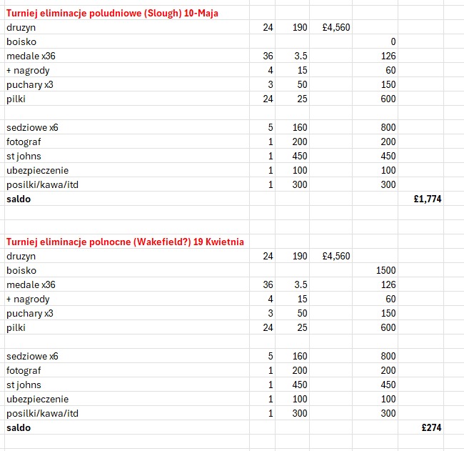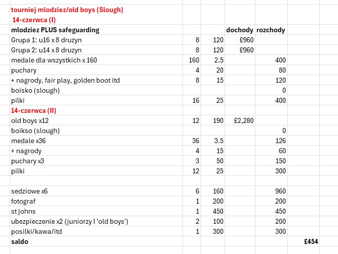 • finanse beda mocne , okolo pls £3000, jak mamy 3 turnieje i dwa beda w Slough, gdzie £1500 na boisko (x2) nie potrzebujemy zaplacic.